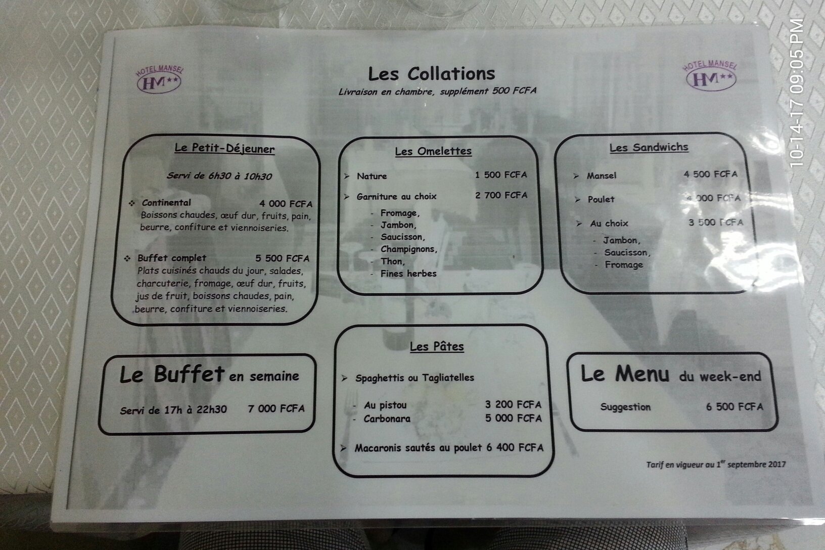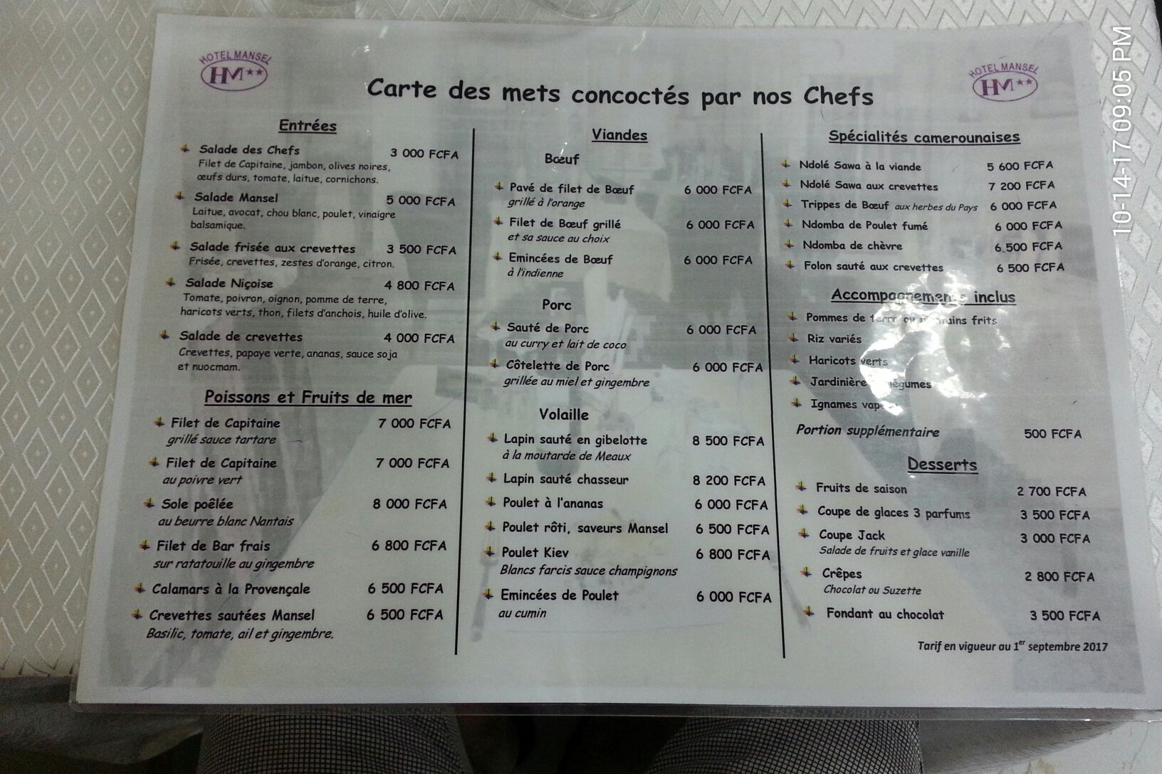 Đây là menu một khách sạn 5 sao ở Yde 40k/đêm. Đồ chỉ ngon tạm được nhưng khá là đắt. Lưu ý là khi vào hỏi khách sạn nếu đi 2 người con trai thì phải nói rõ trước để yêu cầu chỉ 1 phòng. Nhiều khách sạn nó không cho 2 trai ngủ cùng vì nó nói luật cấm. Cần biết cái này để tránh trường hợp khi mệt quá rồi mà ngại tìm khách sạn, hoặc nhà trọ khác mà nó cứ bắt riêng phòng thì lại tốn kém cho anh em.
