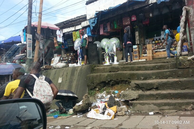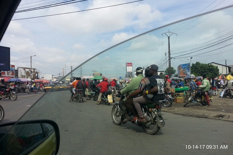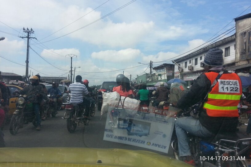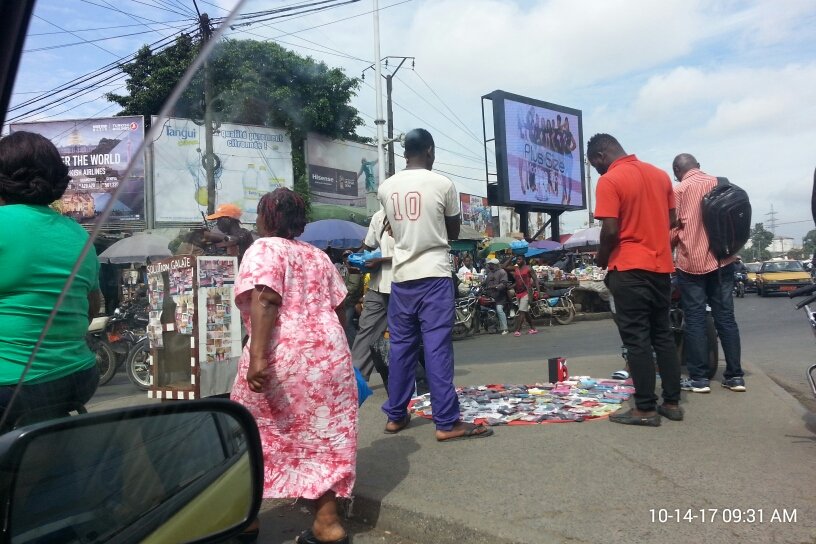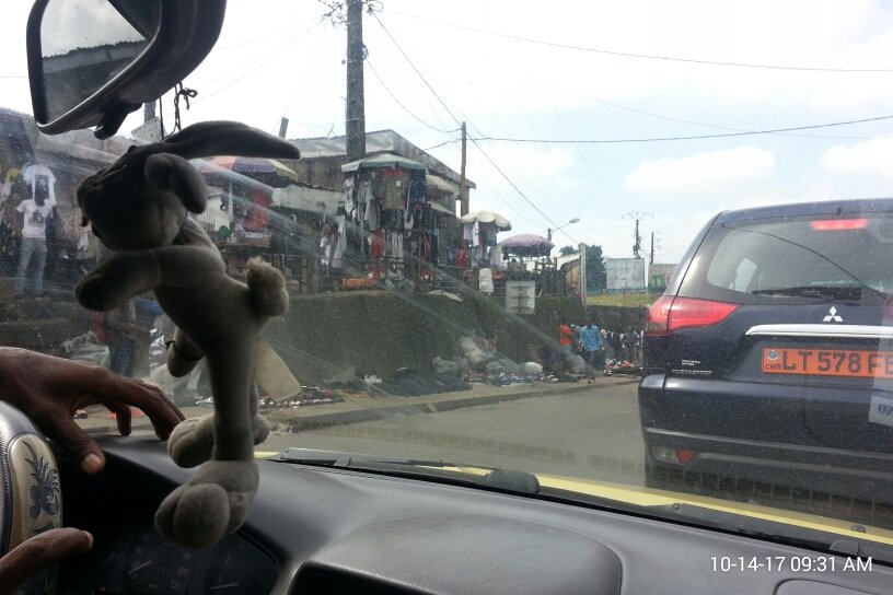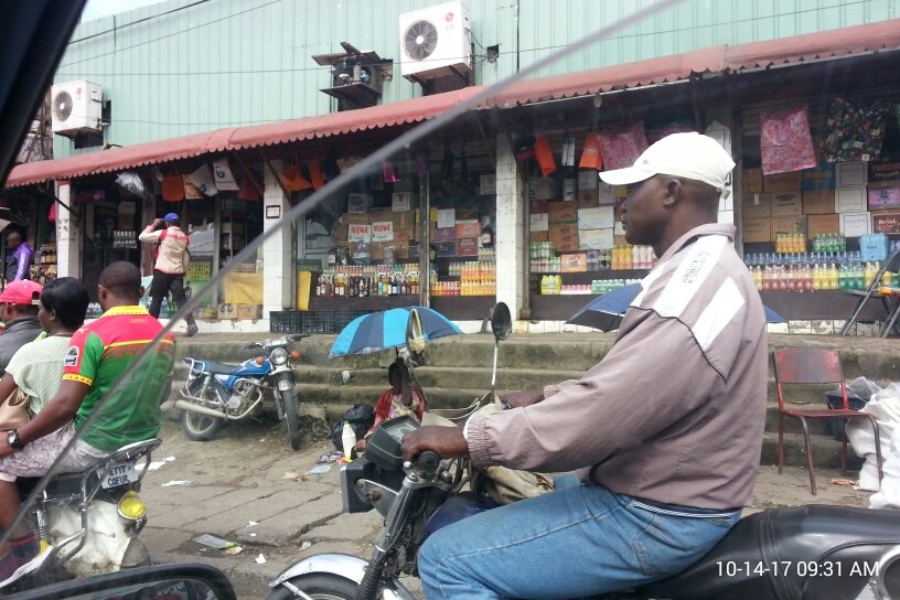 Đường phố nhìn qua cửa kính taxi. Nên để cửa kính cao bởi vì đã có nhiều vụ đang đi đường bị thò tay vào cướp điện thoại đang để trên đùi và trên ghế. Đặc biệt khi đi qua các khu vực nhạy cảm: Nokoti, Newbell, Akwa, v.v..